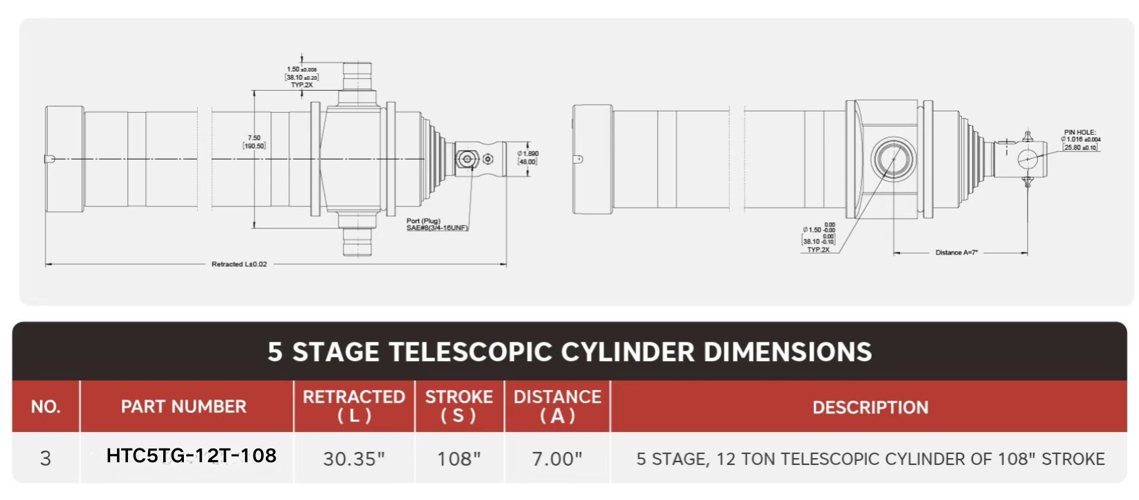 "HTC5TG-12T-108", 5 etapa, 12 tonako 108" trazako zilindro teleskopikoa