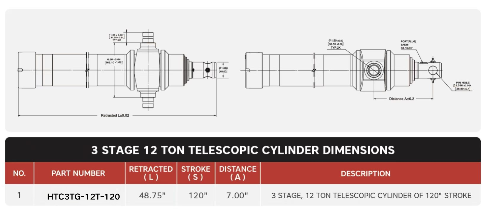 "HTC3TG-12T-120", 3 etapa, 120 tonako 120" trazako zilindro teleskopikoak