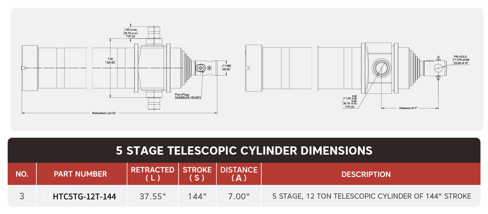 "HTC5TG-12T-144", 5 etapa, 12 tonako 144" trazako zilindro teleskopikoa