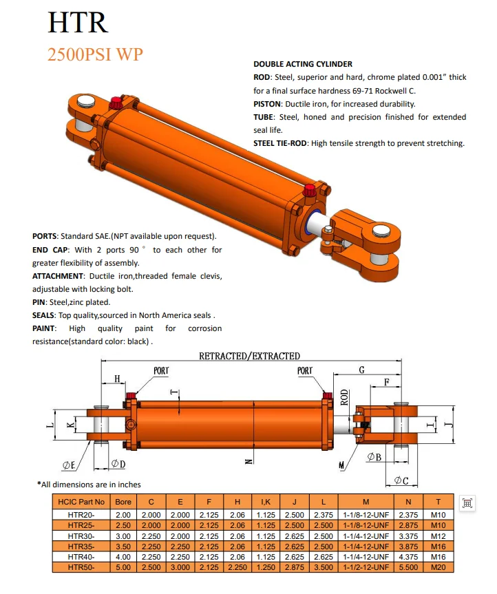 HCIC Standard Clevis Soldadura Zilindro honek 4"-ko zuloa, 36"-ko ibilbidea eta 2"-ko diametroko haga bat ditu. Ekintza Bikoitza SAE 8 (-08) ORB(F) lan-atatuak 2.500 PSI gehienezko lan-presioa Clevis muntaiak 1" muntatzeko pinak barne Pintura beltz distiratsua iraunkorra da eta lausotzeari eusten dio